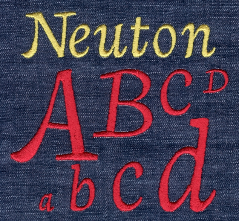 Neuton Satin Font comes in 0.5", 1", 1.5" and 2" heights based on the capital "A". All sizes are finished in standard satin stitch. All sizes included in price. Includes uppercase letters, lowercase letters, numbers and four punctuation marks.