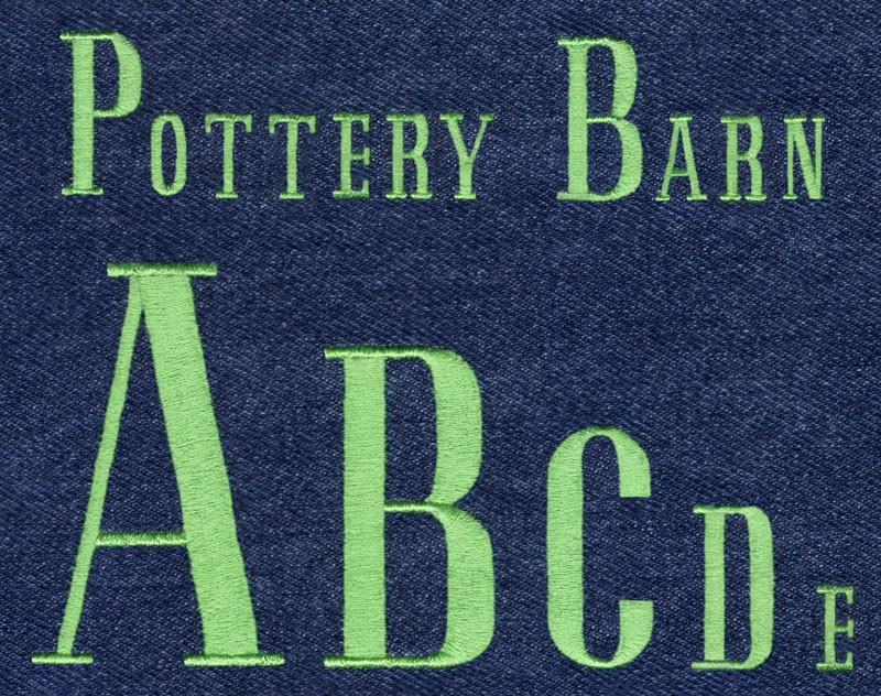Pottery Barn Satin Font comes in 0.5", 1.0", 1.5", 2.0" and 2.5" heights based on t he capital "A". All sizes included for one price. Features uppercase letters, numbers and four punctuation marks as shown in character chart above. Finished in standard satin stitch. PLEASE NOTE:This font has narrow columns (particularly the serifs) that may not stitch as well on thin or stretchy fabric; especially in the smaller sizes. Always use the appropriate stabilizer for your project.